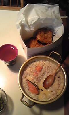 水曜は夜の仕事で!! 終わり帰る途中の駅前のケンタで 980円から半額の490円に!! たまにやってます! 一人の食事は半額のケンタとシャケの牛乳カユ!! もちろん焼酎も!! 一人の時は鍋が多いですね!! …