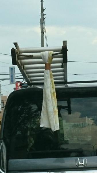 工事の車でしょうが! 裏が白、表が黄色のタオル!! それをガムテープで止めてる!! 車から、はみ出してるから! キレをつけるのは決まりだけど、、、 白いキレじゃ無かったかな? 確かに半分は白いけど!! なんか急に高い所の…