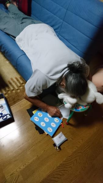 整骨院に行って気が付いた事が!! 顔の所に穴が有れば腹這いが楽!! そこでこんな寝スタイル! 小さいイスにシロを乗せてマクラに! まあまあの寝心地ですね!!