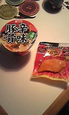 カップ麺とあわせて記念撮影