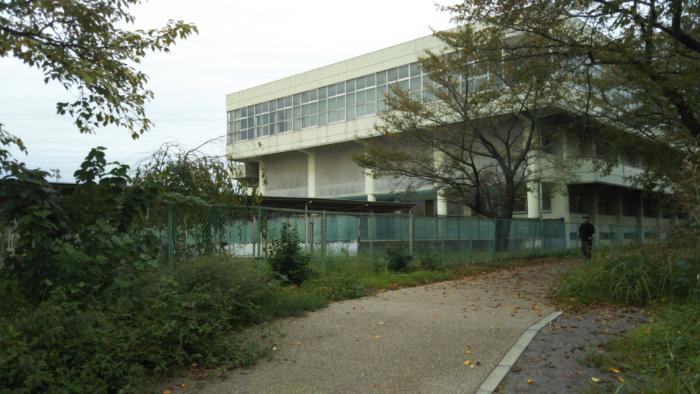 いまは、もう秋…… 。 古隅田川べりから眺めた春中の体育館と、周辺の木々です。 この写真からは見えないけど、手前のプールは、カラカラに水を抜いちゃって、真夏のあの輝く眩しい水しぶきも、はちきれんばかりの歓声も、夢だったの…