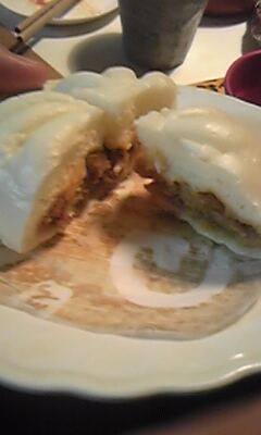 肉まんかあんまんか分かるように 割った写真ですーーー 寒い時期だけじゃなく 食べる暖かい食べ物。 個人的にはソースをつけて食べますーー おいなりさんにも醤油を付けますー やはり少数派ーー