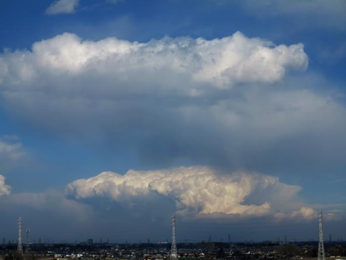 東の空に二段に分かれて発生している「積雲」 (上空の空気層の流れが二段に分かれている為に雲が二段に分かれて発生していると思える)