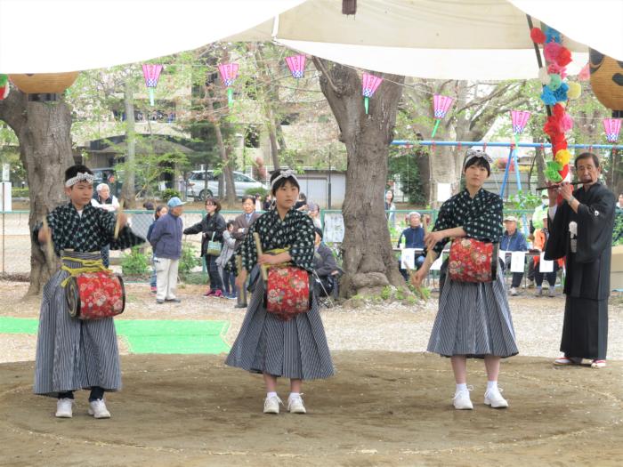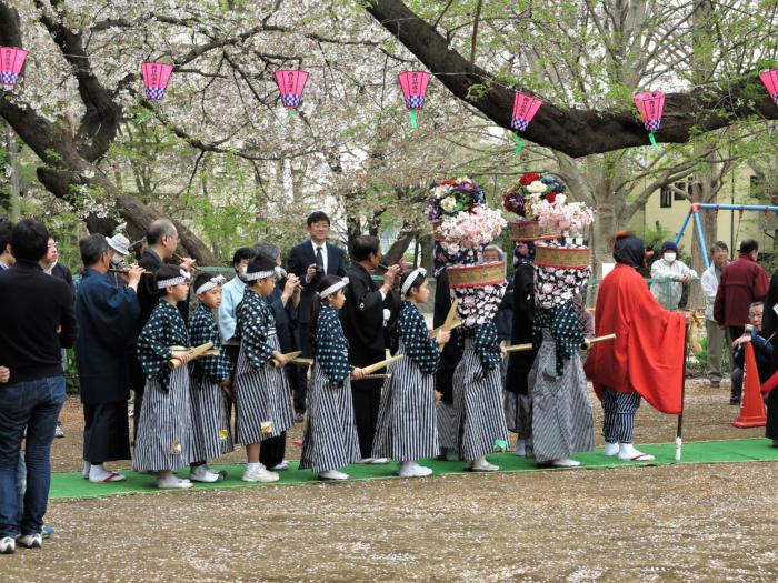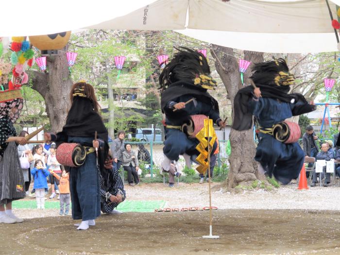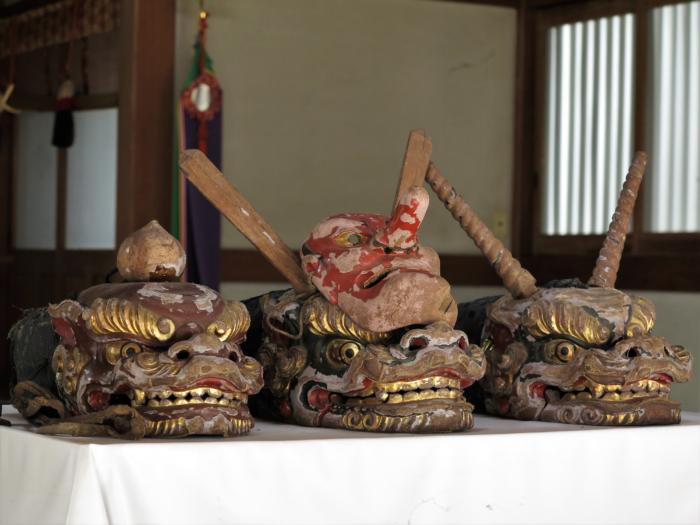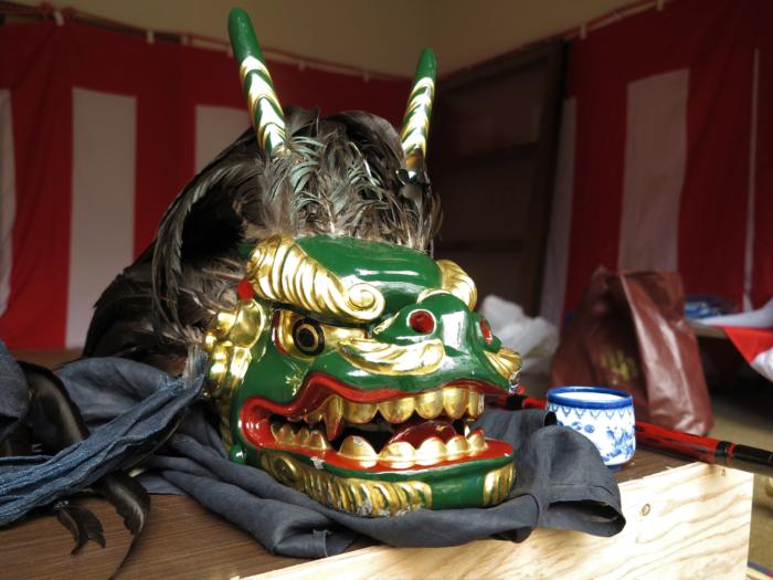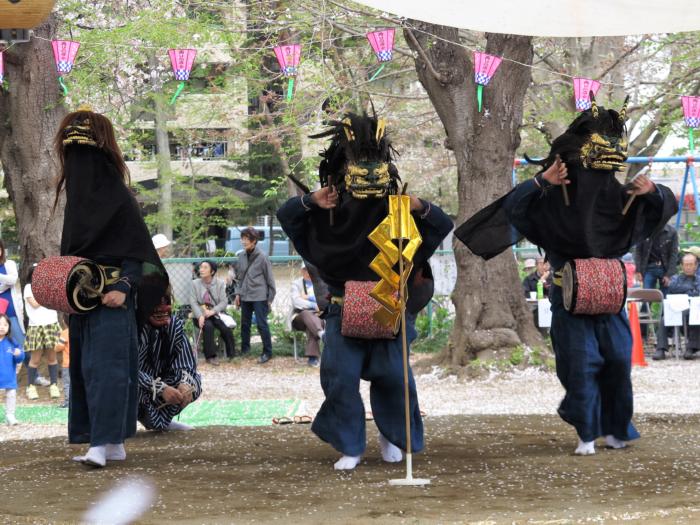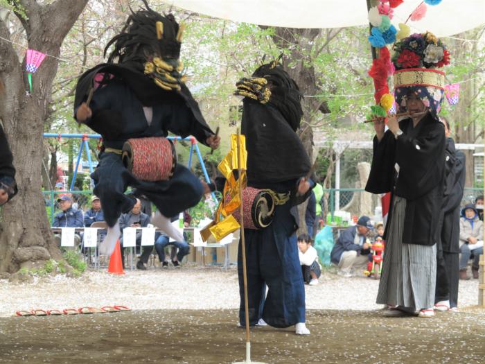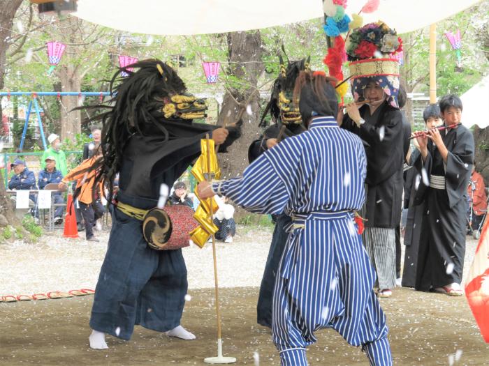 白岡市無形文化財に指定されている小久喜久伊豆神社の「ささら獅子舞」が本日奉納されるので見学に行ってきました。このささら獅子舞は「獅子連中例記」によると文政11年(1828)に深作村(現さいたま市見沼区深作)から伝承されたものという。獅子舞は大獅子、中獅子、女獅子の3頭の獅子と笛吹き、ささら摺(ず)り、天狗、歌方などで構成される。獅子舞の奉納は隔年の4月上旬に「ささら獅子舞保存会」によって行われる。舞の種類は「初手庭(しょてにわ)」「中庭」「幣掛(へいががか)り・鶴の巣籠(すごも)りの舞(女獅子隠{めじしかく}し)」「注連古喜(しめこぎ)・鶴の巣籠りの舞」などがある。