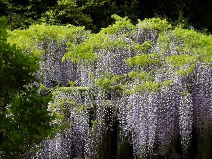 この藤は樹齢千二百余年で山藤に似ているが、つるは右巻きで無毛です。本州・四国・九州の山地にあるが、その最も優秀な園芸の変種です。花房の長さは最も長い物で二メートルにもなり、根まわり十平方メートルあります。花色は美しい藤紫です。樹は根本から数本に分岐して、藤棚の面積七〇〇平方メートル。