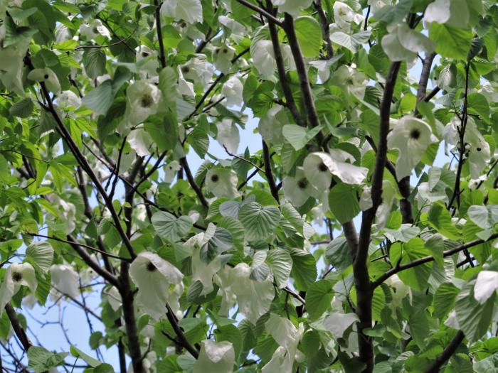 「ハンカチノキ」はミズキ科の落葉高木。中国の四川省・雲南省付近原産。属名のダビディア で呼ばれることも多い。花についた白い大きな2枚の苞葉が垂れ下がりよく目立つため、日本では「ハンカチの木」や「幽霊の木」などと呼ばれる。 前年枝に白いハンカチのような姿の花を咲かせます。しかし、花弁はなく、たくさんの雄花と1個の雌花が1つの球形をつくり、大型の2枚の苞に抱かれるような形で開花します。