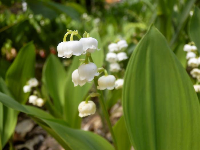 「スズラン」(鈴蘭) 葉は粉白をおびた緑色で2つつけ、長さ20cmほどの長楕円形。芳香性、壺形の白色の花を総状に10ほどつける。花が葉よりも低く咲くのが特徴。長い根茎を四方に伸ばしてふえ、数年経つと咲くようになる。日本に自生するスズランは、葉の陰に白いベル型の花をつける。 花や根にはかなり強い毒があり、アイヌの人たちはその汁を矢の先に塗っていたそうです。