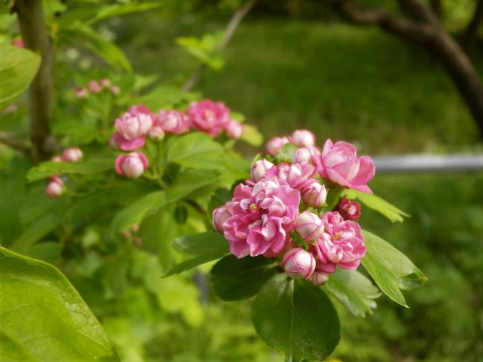 「セイヨウサンザシ」(西洋山査子) 日本では白い花を咲かせ、赤または黄茶色の実がつくサンザシや、ピンク色の八重咲きのセイヨウサンザシが栽培されます。生薬名を山査子(さんざし)といい、健胃・整腸剤として利用される。