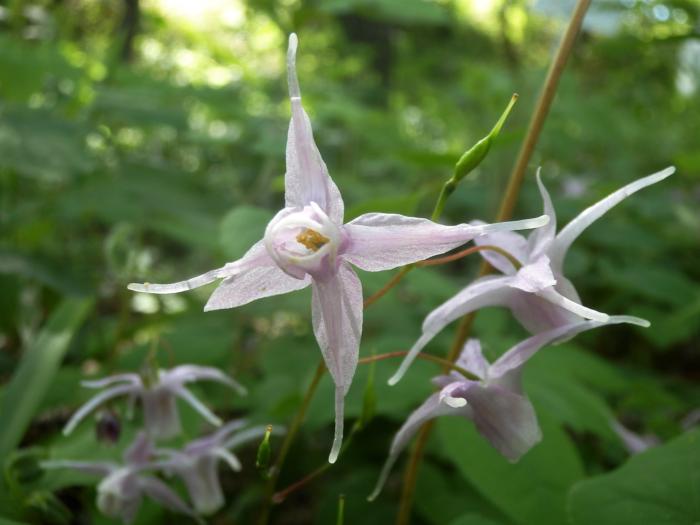 「イカリソウ」(錨草) 距が突き出し錨(イカリ)のような形の花を咲かせることから名がつきました。花色は薄紫、赤紫~ピンク、薄黄色、白などです。花は葉の上部よりも下側にうつむき加減に咲かせるので派手さはなく楚々とした印象です。