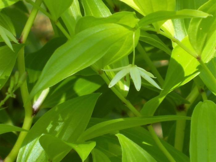 「チゴユリ」(稚児百合)  高さ15-30 cm。白くてやや太い地下茎を持つ。茎の先端に1 cmほどの白い花を一つ咲かせ、花後に黒色の液果をつける。