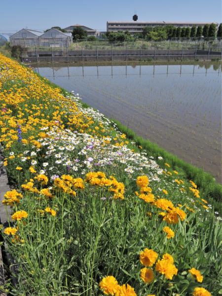 黒沼用水路から水を取り入れた田んぼと花壇