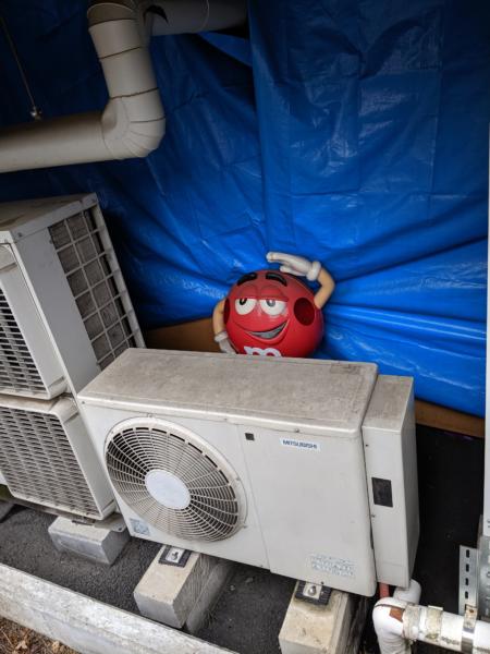例大祭の後片付けで発見 フジガーデンの室外機の裏に こんな感じに 誰かが手を振ってるᕙ( • ‿ • )ᕗ 寂しそう༎ຶ‿༎ຶ