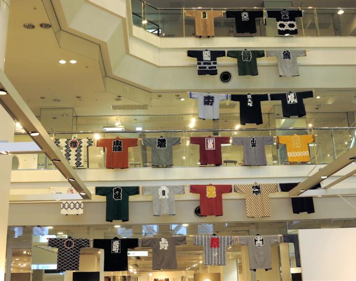 匠大塚春日部本店一階吹き抜けに飾っている各町内で着用する印半纏(7月15日まで展示中)