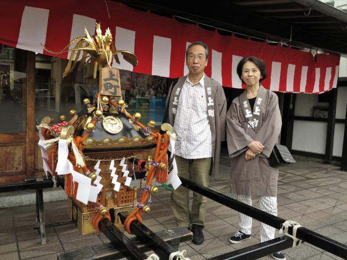 永島庄兵衛商店前に飾っている上町子ども神輿前にて(加島和代・木村鷹志) 敬称略