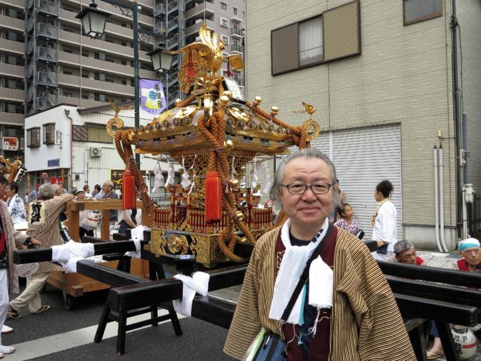 町会責任者として大人神輿パレードで町神輿を先導している「松永彰」君