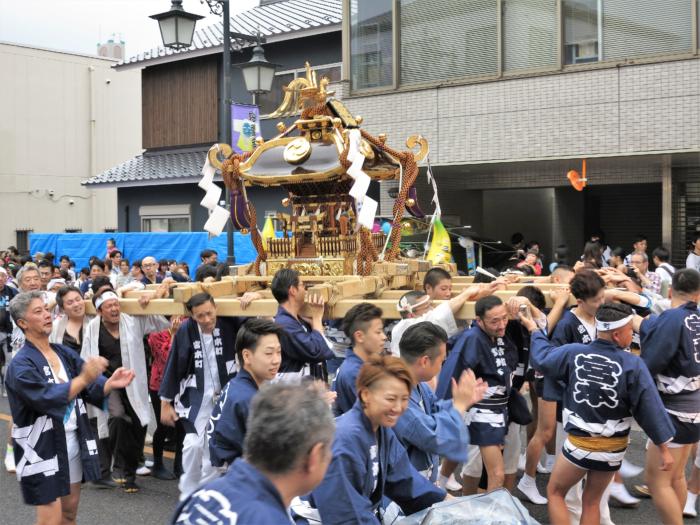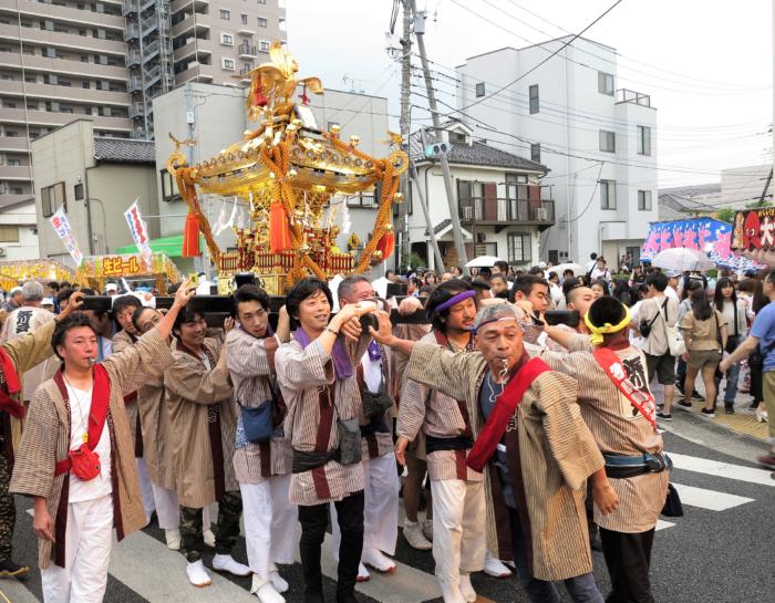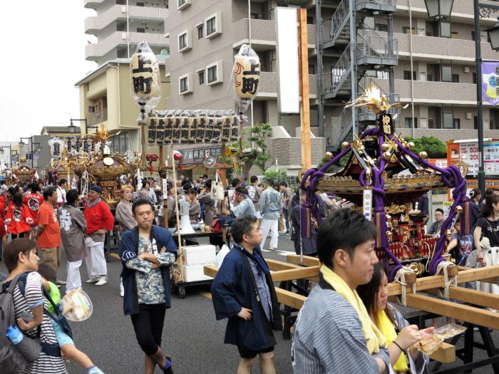 アイキャッチ画像は大人神輿パレードのスタートを待つ各町内のお神輿の列