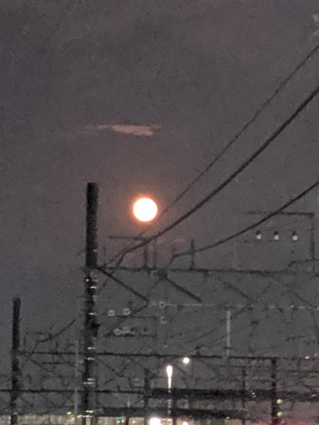きれいに写せなかった m(_ _)m 地下道の東口側の陸橋な 向かっての月! しばらくぶりに! 月を眺めた!! なんか 色と言い 大きさと言い