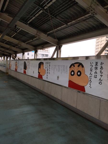 春日部駅の東京よりの跨線橋に しんちゃんのなが〜いポスター 誰かしっかり写真を載せてください m(_ _)m なぜかアップロードできるのが 少ない༎ຶ‿༎ຶ どうも分からない〜〜 載せらるのとダメな時、写真…