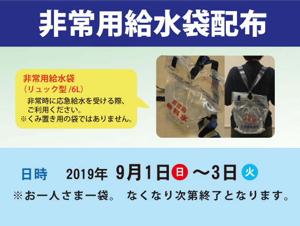 8月30日~9月5日が防災週間で災害時の飲料水等について見学、防災週間に因んで災害時に活用できる非常用給水袋(リュック型)をいただいて来ました。