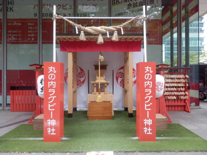 ラグビーワールドカップに合わせて丸ビル外構部に「丸の内ラグビー神社」を建立したと聞いていたので必勝祈願のお参りに立ち寄りました。当神社は、京都市鎮座の世界遺産「下鴨神社」の境内にあり、ラグビーとゆかりの深い「雑太社(さわたしゃ)」の神様をお祀りしています、ラグビーを通じて生まれる人と人とのつながり、そして新たな出会いを祈願。近くでチコちゃんも見守っていますよ。