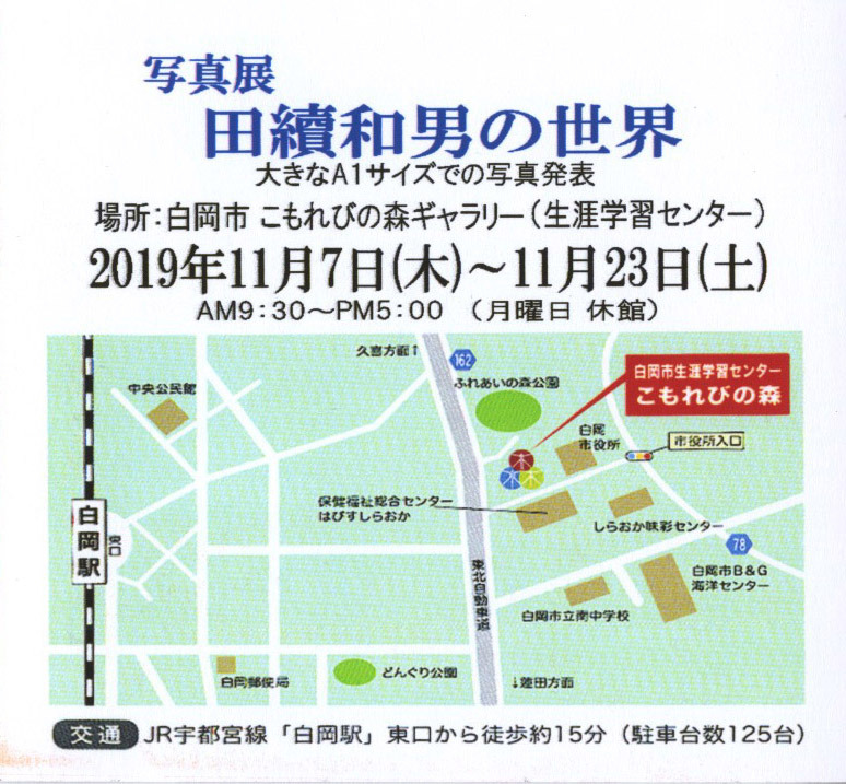 2019.11.15 村田 均 akasaka 田續和夫写真展鑑賞及び散策 白岡在住の写真家「田續和夫」氏による「しらおか梨物語」と題して梨畑の一年を題材にした写真展が7日~23日迄白岡市こもれびの森ギャラリーで開催、本日近くへ出掛けたので見に行って来ました。合わせて「こもれびの森及び運動公園」を散策してきました。 アイキャッチ画像は市役所内に咲いている十月桜 「しらおか梨物語」 写真展は白岡市・教育委員会・観光協会・美術家協会の合同後援として開かれています。皆様も梨の一年を見に来てみませんか。 田續和夫写真展が行われている「こもれびの森」 散策トピックス 4 件のコメント 寒桜の花びらって、割と大きんだね。群馬の鬼石だか神流町だかの冬桜を見たけどももっと小さかったような。寒桜と冬桜は種類が違うのかな。 返信する 冬場に咲く桜を下記ご紹介します。 「十月桜」マメザクラとコヒガンザクラ(小彼岸桜)の雑種で、小輪八重咲き。 「冬桜」ヤマザクラとマメザクラの雑種。葉が小形であるので小葉桜とも呼ばれる。 「寒桜」寒緋桜と大島桜との雑種。 返信する さすが、よく観察してますね! 俺なんか〜おーキレイ! 花見酒でも! しか無いですよ! 返信する こもれびの森! 凄いですね! 白岡は凄いですね! 返信する コメントを残す コメントをキャンセルメールアドレスが公開されることはありません。 ※ が付いている欄は必須項目ですコメント ※ 名前 メール サイト 次回のコメントで使用するためブラウザーに自分の名前、メールアドレス、サイトを保存する。
