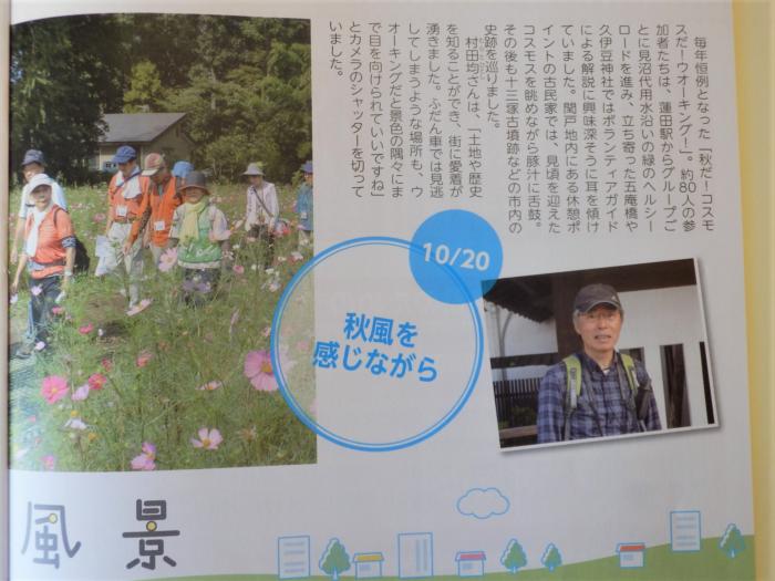 2019.11.18 村田 均 akasaka 蓮田市広報に掲載 10月20日蓮田市で実施された「秋だ!コスモスだ!ウォーキング」に参加したところ市の広報の方から参加しての感想についてインタビューを受けた内容が蓮田市広報誌11月号に掲載されました。 アイキャッチ画像は掲載内容を拡大したものです 蓮田市広報11月号表紙 広報誌「まちの風景」掲載見開き 蓮田市広報誌PDF版は下記をクリックして頂ければ見る事が出来ます。 蓮田市広報2019.11 2 件のコメント これはスゴい! 快挙! 何部か貰っておいた方がいいですよ。 あとで見せてください。 返信する 同感です! 凄いですね! いろいろな活動が有るんですね! 感心します 返信する コメントを残す コメントをキャンセルメールアドレスが公開されることはありません。 ※ が付いている欄は必須項目ですコメント ※ 名前 メール サイト 次回のコメントで使用するためブラウザーに自分の名前、メールアドレス、サイトを保存する。