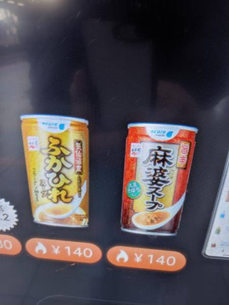 どうも一人での食事は(╯︵╰,) ふと気がついた! 自販機のホットシリーズ!! オーー 有る有る! ちょっと豪華な中華スープ! しばらく歩くのも していなかった〜 こんな豪華中華スープ発見! しかし自販機万能!