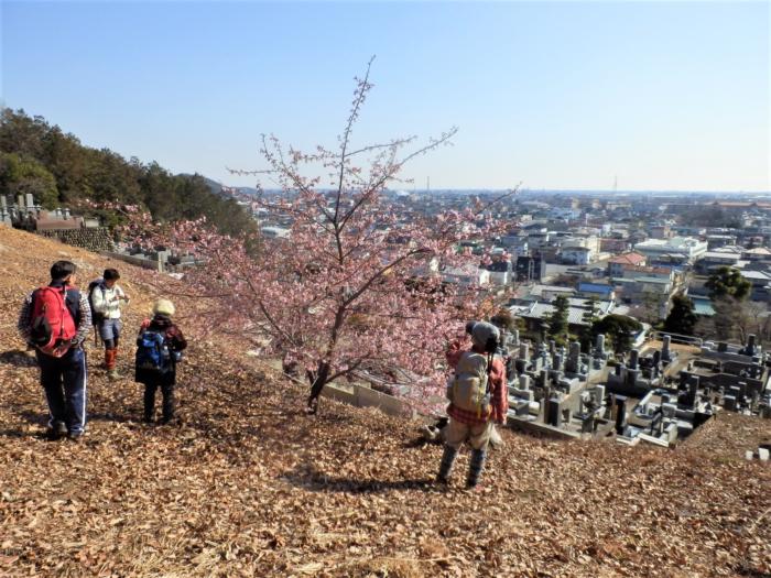 コース途中にある早咲きの桜をめでながら足利市街の眺望を楽しむ