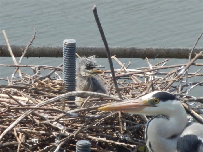 27日ママチャリ散策の折に発見したアオサギの巣、親鳥が卵を温めていたので本日気になり再び観に行って来ました、二つあった巣のうち奥側の巣で一羽のヒナが元気よくふ化していました、手前の巣はまだふ化していませんので4日~5日後…
