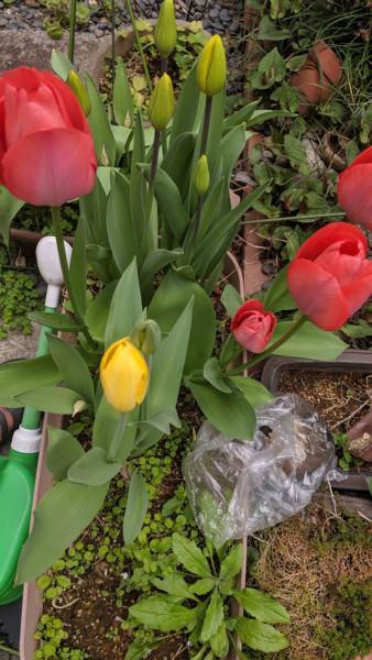 色によって咲く時期が 微妙にズレるんですね! 歌のイメージなのか いろいろな 色がイッキに咲くイメージが! 黄色のチューリップが 咲き初めました まだまだツボミが多いですが さらに 全くツボミのチューリップも あるんです…