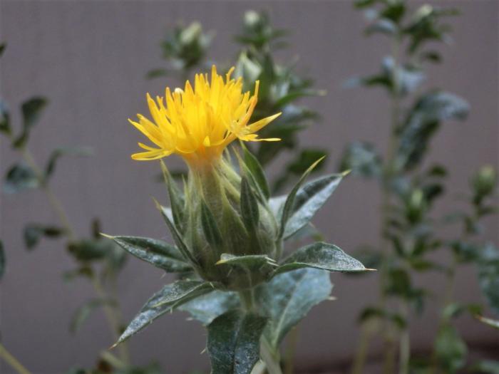 桶川市で開かれている【べに花まつり】へ昨年お邪魔した折に頂いた種をプランターに蒔いた物が無事に開花、路地植えでない為か少しばかり小さいように思えますが黄色く可愛らしい花が咲いてくれました。