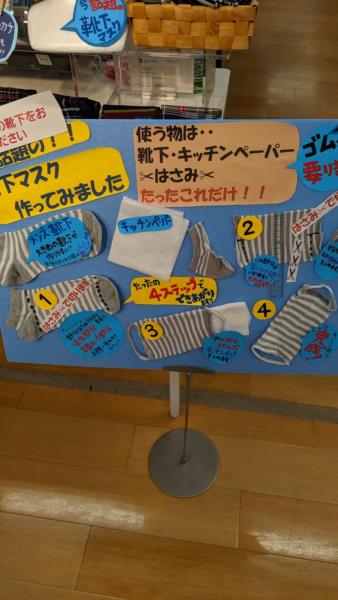 マスクもダンダン出回って 来ました! 手作りマスクも! いろいろなキットや作り方が!! 普通のスーパーのマスクの作り方パネル!! 靴下マスク!! ウフフ 誰から靴下を貰おうかな!!