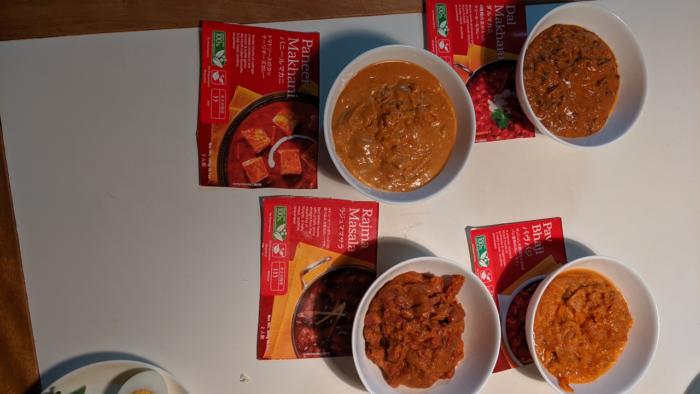 4種のカレーでカレーパーティ! 残念ながらみんな豆〜 4箱1000円! さらに一箱二人分〜〜 一人前約180円!! 失敗したのは 合計8人分〜〜 食べきらない〜 カレーをツマミに