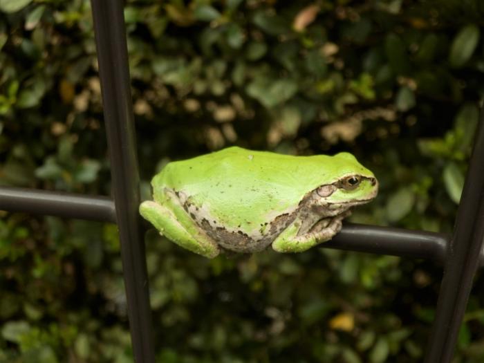 雨が上がったので少しばかり散策に出掛けたら近所のネット状のフェンスにバランス良く乗っていたカエルを発見、何となく可愛かったので写真を撮ってしまいました、太さは約4~5mm位かな。
