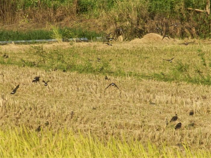 白岡の田んぼが稲刈りで慌ただしくなり田んぼの畦道や一般道をコンバインが走り回っています。刈り取りの後には鳥たちが捕りやすくなったご馳走を忙しく食べています。