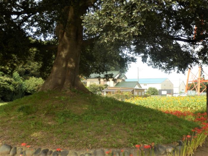 白岡市下野田地区にある一里塚の周りが向日葵と曼殊沙華で彩りよく飾られ見頃を迎えて来たので散歩を兼ねて観に行って来ました。夏の向日葵、秋の曼殊沙華と不思議な組み合わせの花園です、この一里塚は地区の方々が季節に応じて様々な花々を植えられて何時行っても楽しめ場所となっています。下野田の一里塚は日光御成道沿いに設けられたもので、日本橋から数えて11番目の塚になっています。なお、両側に塚の残る一里塚としては県内唯一で、県指定の史跡となっています。