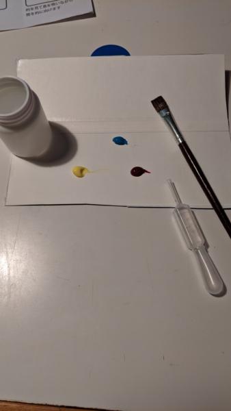 スポイトが食卓に転がっていたんて マスクの横にサイズ感覚で置いたのは お答えしましたが 実際にはこんな感じでお絵描き さすがに食卓なんで いろいろな物は置けませんので 理論的には三原色で色は足りると思い 絵の具3本とスポ…