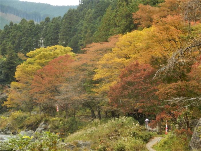 彩りを増す多摩川の両岸を周回するように駅からハイキング「自然豊かな御岳渓谷の紅葉と名所・寺院めぐり」に参加、コースは御嶽駅をスタート⇒杣の小橋⇒神路橋⇒青渭神社⇒沢井駅⇒雲慶院⇒福島家住宅⇒小澤酒造⇒櫛かんざし美術館⇒寒…