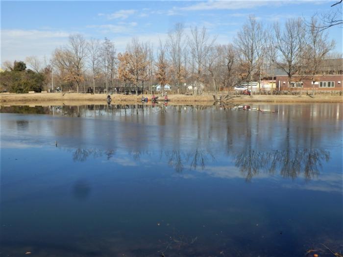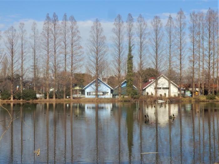 東武動物公園東ケートそばにある池越に園内を望む、池にはカワウ等が多くいました