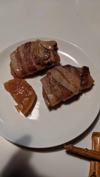 腰がちょっとキツイんて 大人しくしてます! 動きが無くなったんで 野菜も食べないと(╯︵╰,) ダイコンの豚肉巻き! 以外にイケますね! 半月切りのダイコンを 豚肉でクルクルと巻いて 軽く塩コショウで 小麦粉を付け 煮付…