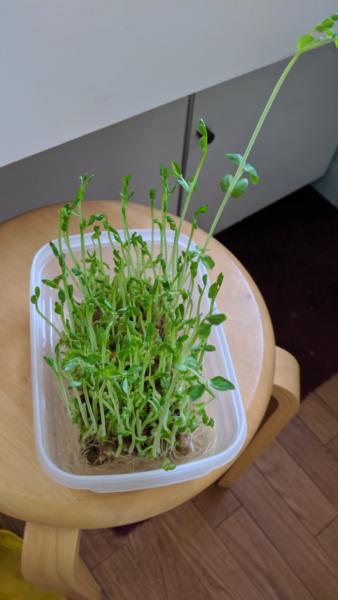 一本だけ芽が出た豆苗ですが なんとか出揃ったようです! 腰がダメですが これくらいなら持ち上げられますね もう少し育てて 豆苗の炒めを! まだまだ動くのは(༎ຶ ෴ ༎ຶ)