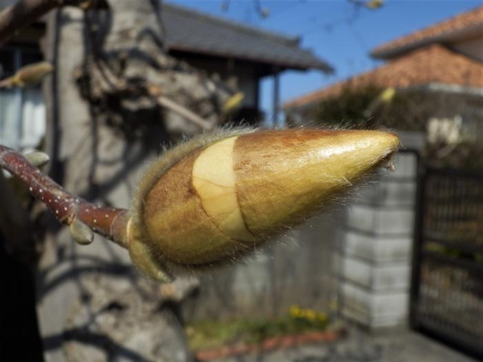 外皮を裂いて膨らみはじめた「ハクモクレン」の花芽