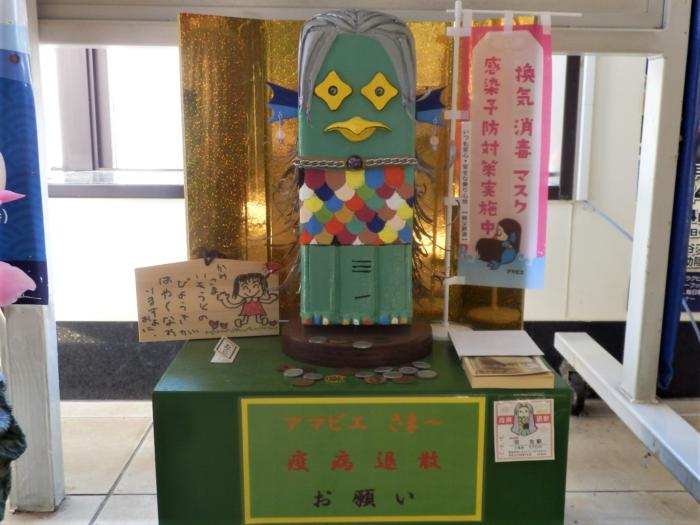 疫病退散(コロナ)を願って秩父鉄道羽生駅に祭られた「アマエビ神」