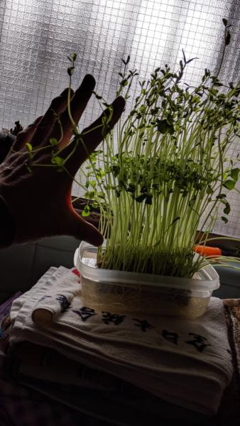 しっかり豆苗が伸びました! こんなだったのに しっかり収穫です! 中華料理風に 味は(╯︵╰,) ちょっと塩が多かった(༎ຶ ෴ ༎ຶ) はたしてまだ収穫できるか 再挑戦してみました