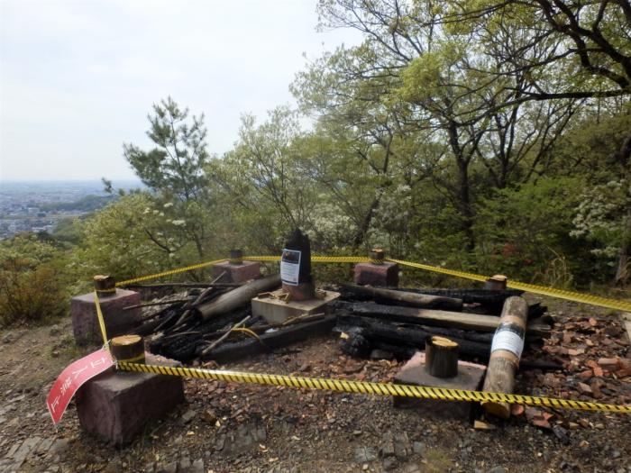 アイキャッチ画像は検証中に立寄った天狗山山頂にて(天狗山山名標識の支柱も焼け焦げていました)