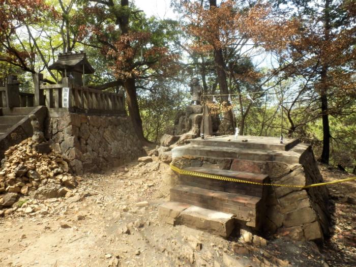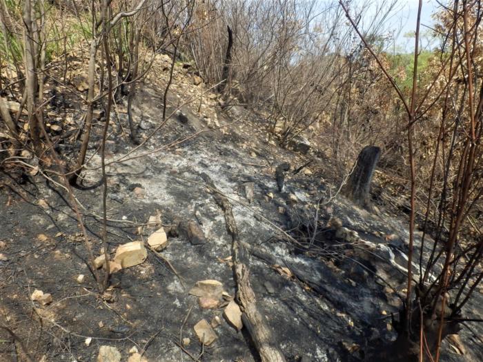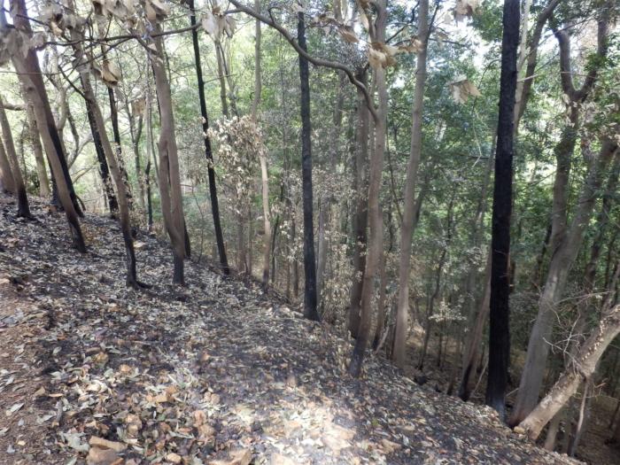 両崖山頂にあった木造の社や山頂下にあった東屋なども消失しており山肌斜面の落葉や下草もかなりの面積が焼けていました、救いだったのは立木の根元周りの木肌が多少焼けていた程度で済んでいましたので自然回復が早く叶うかと思います。