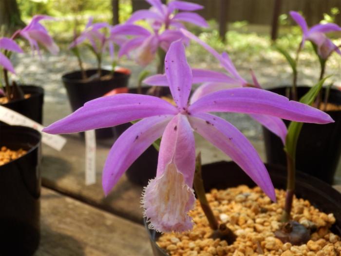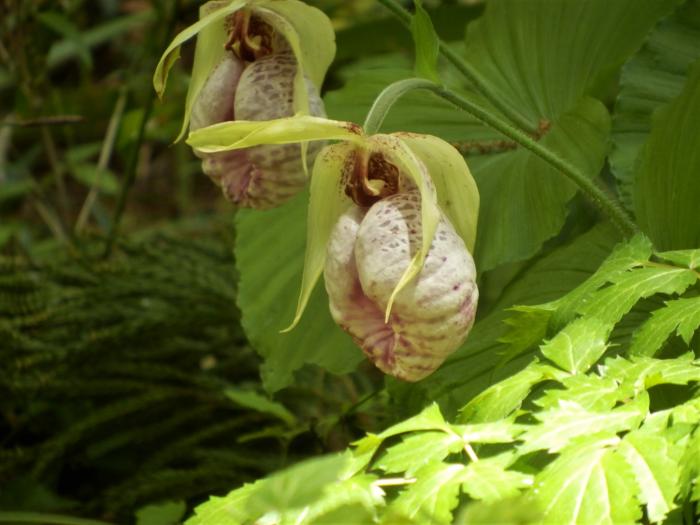 袋を下げたような花で大きさは10センチくらいあり、日本の野生ランの中では一番大きく、不思議な形をしている、環境省のレッドリスト(2007)では、絶滅危惧II類(VU)に登録されている。武将の熊谷直実にちなんで名づけられた、「熊谷草」と「敦盛草」の名は、平家物語の「敦盛の最期」の話にちなんでいる。