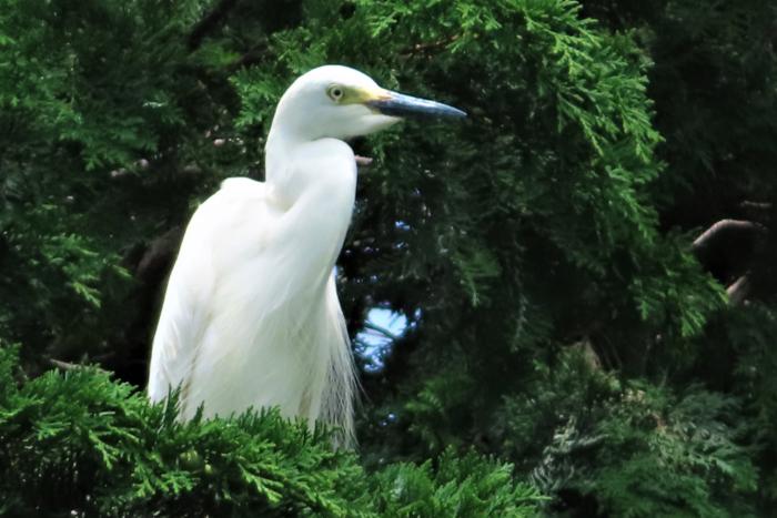 公園内の樹上で子育て中の「コサギ」
