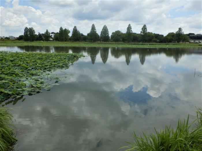 アイキャッチ画像はつつじが岡公園内の城沼に映る夏雲