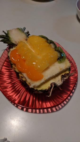 なんとバイナップル半分の! 自作なんです(╯︵╰,) ウソですm(_ _)m 和菓子屋さんのケーキです(ノ^_^)ノ せんげん台の獨協高校の入口の 和菓子屋さんです! 浦和にある白い玉みたいな お菓子が有るんで 安いんで…